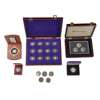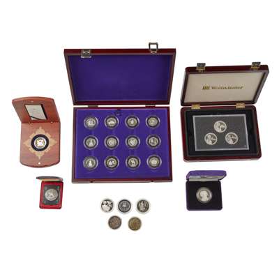 to include: Perth Mint, wood cased commemorative gold and silver coin for accession to throne, with cert; NZ and Australia reproduction brass WWI tin with two proof silver coins $1; 2002 Manchester commonwealth games cased set of four proof £2 coins; Aus. proof silver 1oz coin Lizard; 2007 proof piedfort silver crown; France 2007 rugby coin; a quantity of circulated £2 and £1 coins; box miscellaneous; base metal coins (modern); various minor modern proof silver coins; cased set of 24 proof coins relating to Queen Elizabeth the Queen Mother Commonwealth countries; Royal Mint, cased presentation set of 12 silver proof coins 2003 coronation anniversary each 50p; group of ten silver proof coins Lest We Forget and certs; group of proof 50p pieces (8); base metal gilt and colour printed coins; two drawers with sections and 47 mainly base metal but some silver crown size coins; set silver Landmarks of the World ingots (10); cased presentation set of three silver proof coins Guernsey Armed forces 2011, etc. (Qty)