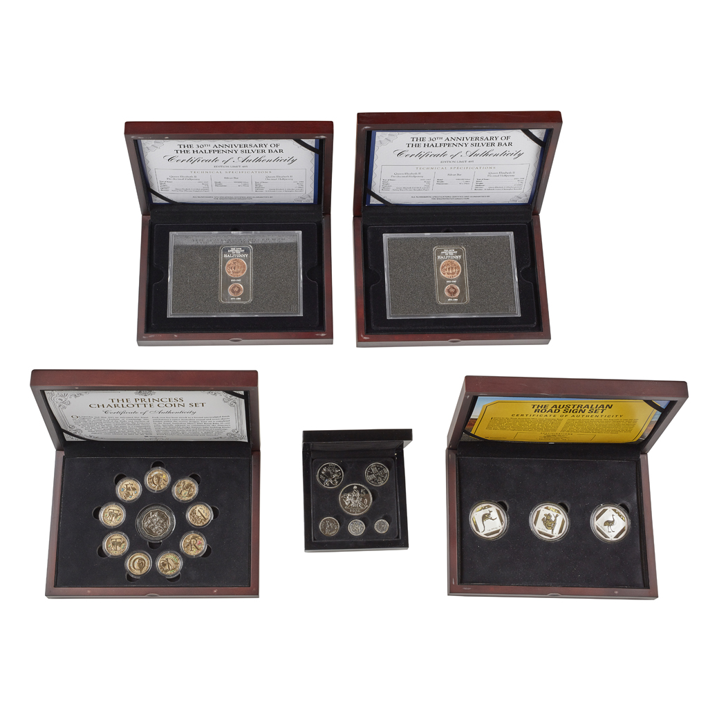 to include; Australia, Princess Charlotte coin set (10); reproduction 1936 six coin set; two of the silver ingot 30th anniversary of the halfpenny; large group of coins relating to HM Queen Mother (24); D Day stamps and three crowns 70th Anniversary; box of 20+ mixed base metal odd collector's coins; box 50+ relatively modern 50p pieces with commemorative themes; Australia, edition three silver proof coins The road Signs set; etc. (qty)