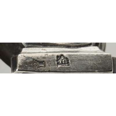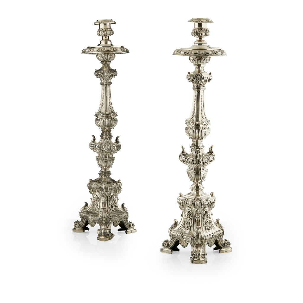 18th Century Lisbon, maker A/IG, the column of triangular form, decorated with scrolls, harebells and shell motifs, the main spreading base section with putto heads on a shell and foliate background, with bold leaf scrolls to the feet (2)