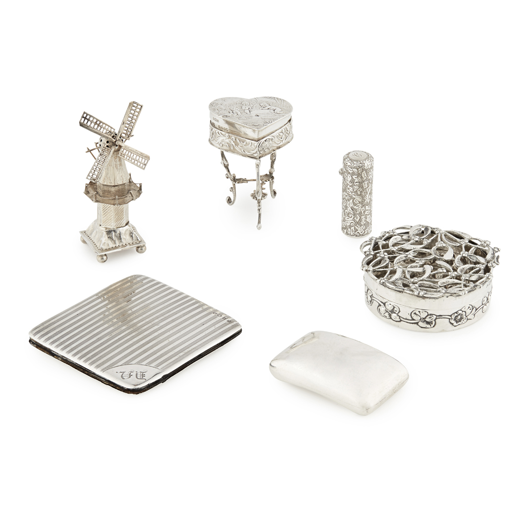 to include; a heart shaped miniature table with hinged cover, embossed decoration and raised on cabriole legs; a miniature windmill, a small scent bottle, all over engraving; a George III curved snuff box, John Thropp, Birmingham 1808; a small note case and a small pot pourri box with pierced cover, William Comyns, London 1909 (6)