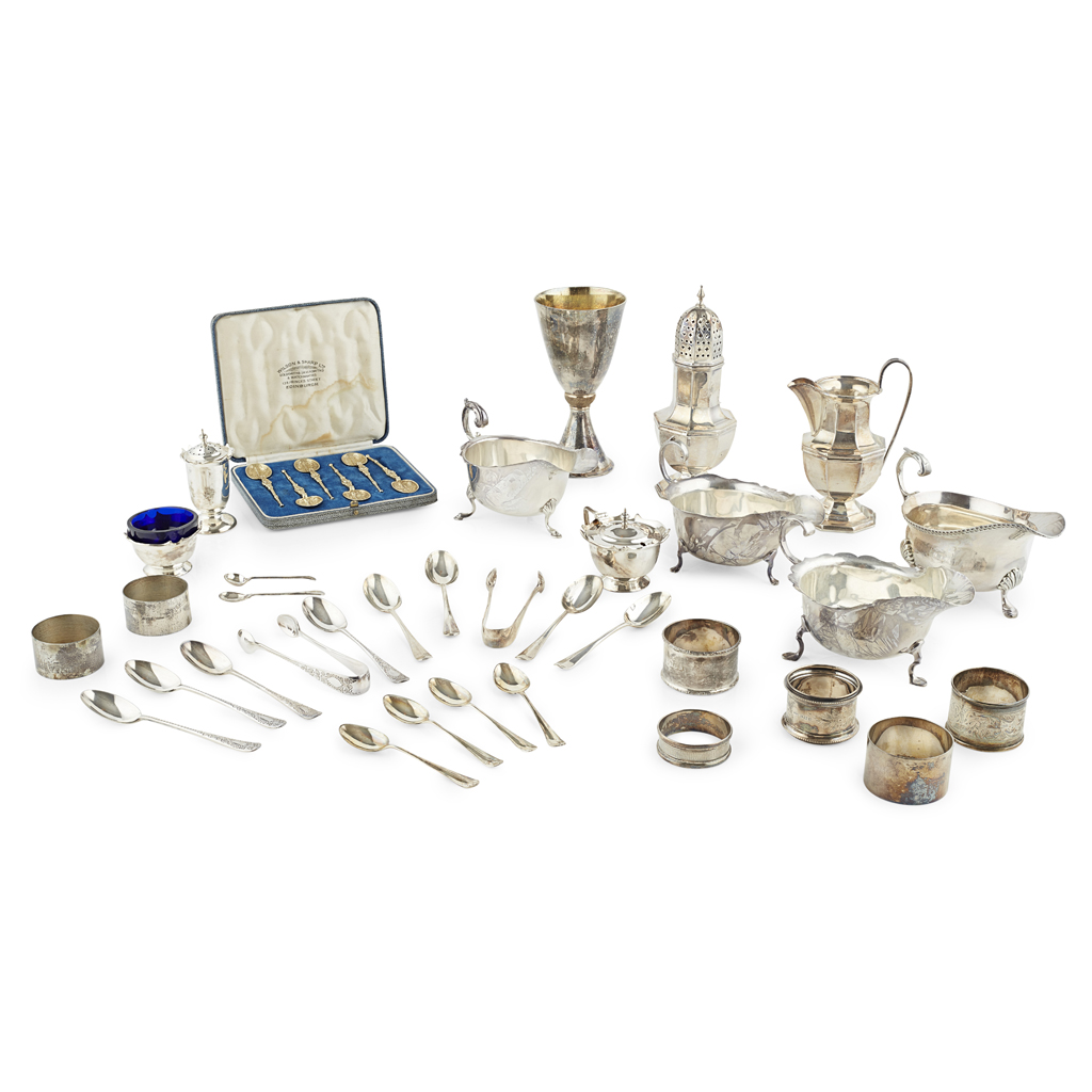 to include, a commemorative cased goblet, Mappin & Webb, London 1972, celebrating the wedding anniversary of Queen Elizabeth II and Prince Philip; a cased condiment set, Birmingham 1906; a cased sugar caster and jug, Viners Ltd., Sheffield 1937, both of octagonal form; a cased set of twelve teaspoons and tongs; a cased set of teaspoons; four modern sauce boats; seven various napkin rings; collection of various teaspoons, coffee spoons and condiment spoons (qty)