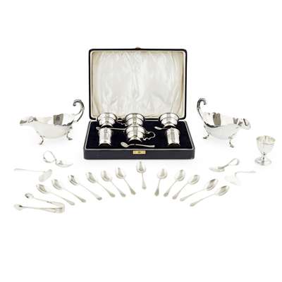 L & R., Birmingham 1937, comprising two salts, two mustards, two peppers and accompanying spoons, all of circular form demi fluted bodies; together with a cased pair of sauce boats Viner's Ltd, Sheffield 1936, scallop border; a cased set of eleven Art Deco teaspoons and a pair of tongs; an egg and spoon set, Birmingham and two cased set of pap spoon and pusher (qty)
