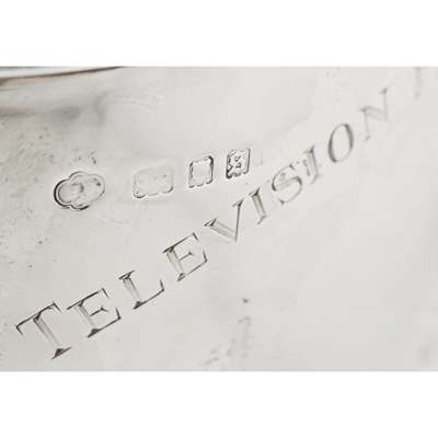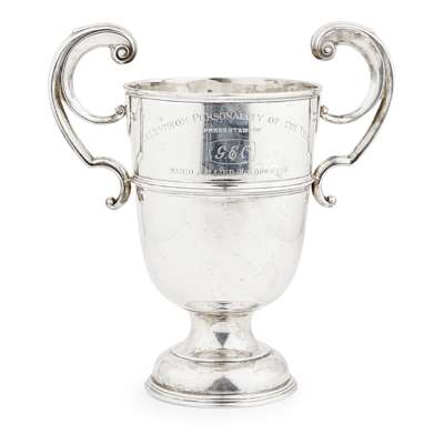 H Phillips, London 1933, the simple cylindrical bowl with reeded girdle and inscription, 'TELEVISION PERSONALITY OF THE YEAR...' to one side and recipients including 1974 MAGNUS MAGNUSSON to the other, with twin large S scroll handles and raised on simple domed foot