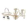 Edward Barnard & Sons Ltd, London 1928, comprising coffee pot and water pot, both of stylised tapered form hemispherical base, angular handles with heart thumbpieces, raised on a stylised bracket foot; together with a swing handled basket, George Edward & Sons Sheffield 1915, of moulded rectangular form with pierced border, raised on four ball feet; a cream jug Henry Clifford Davis, Birmingham 1939, scallop border and a condiment set, various makers and dates (qty)