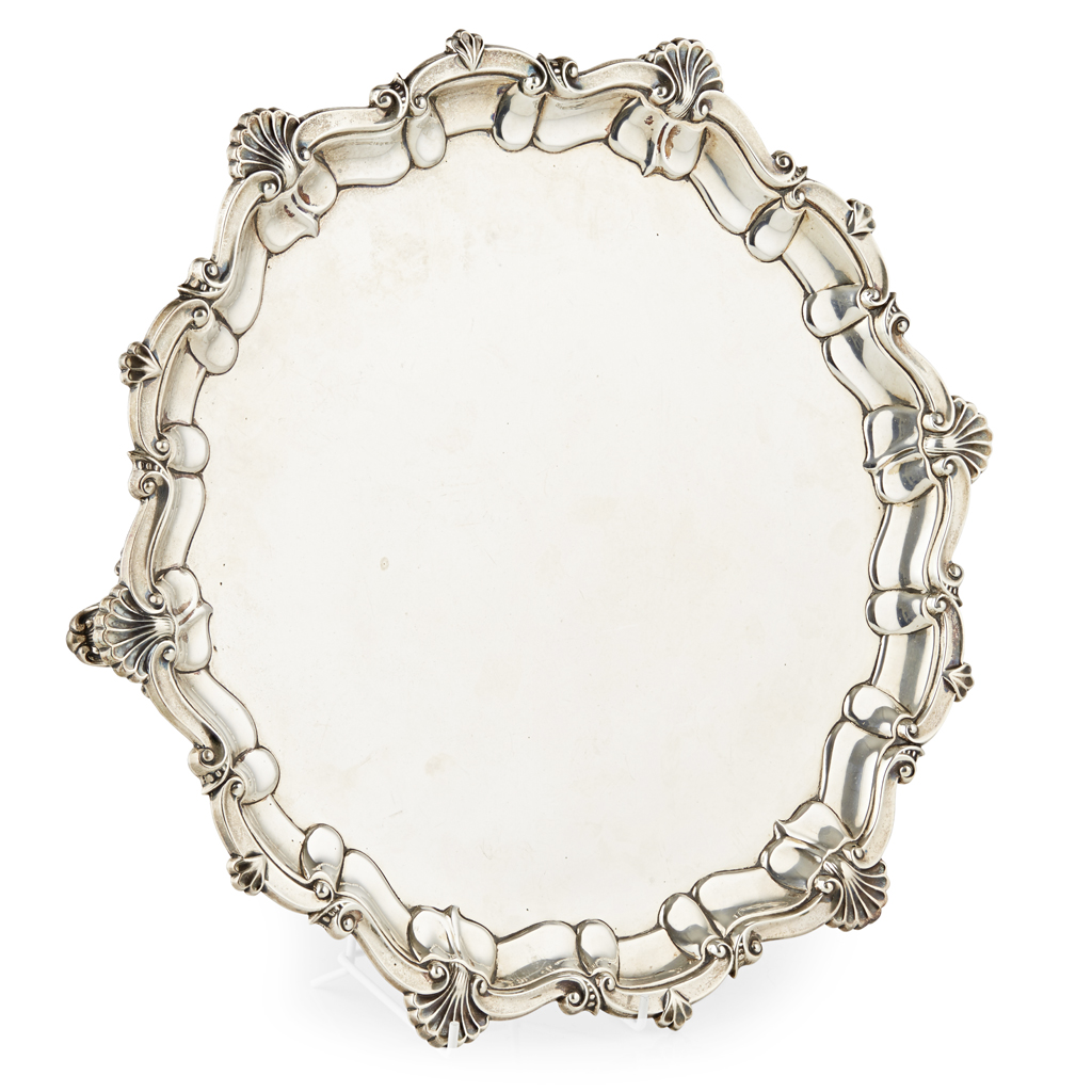 Garrard & Co Ltd, London 1925, of moulded circular form with raised cast shell border, raised on three bracket feet with shell detail