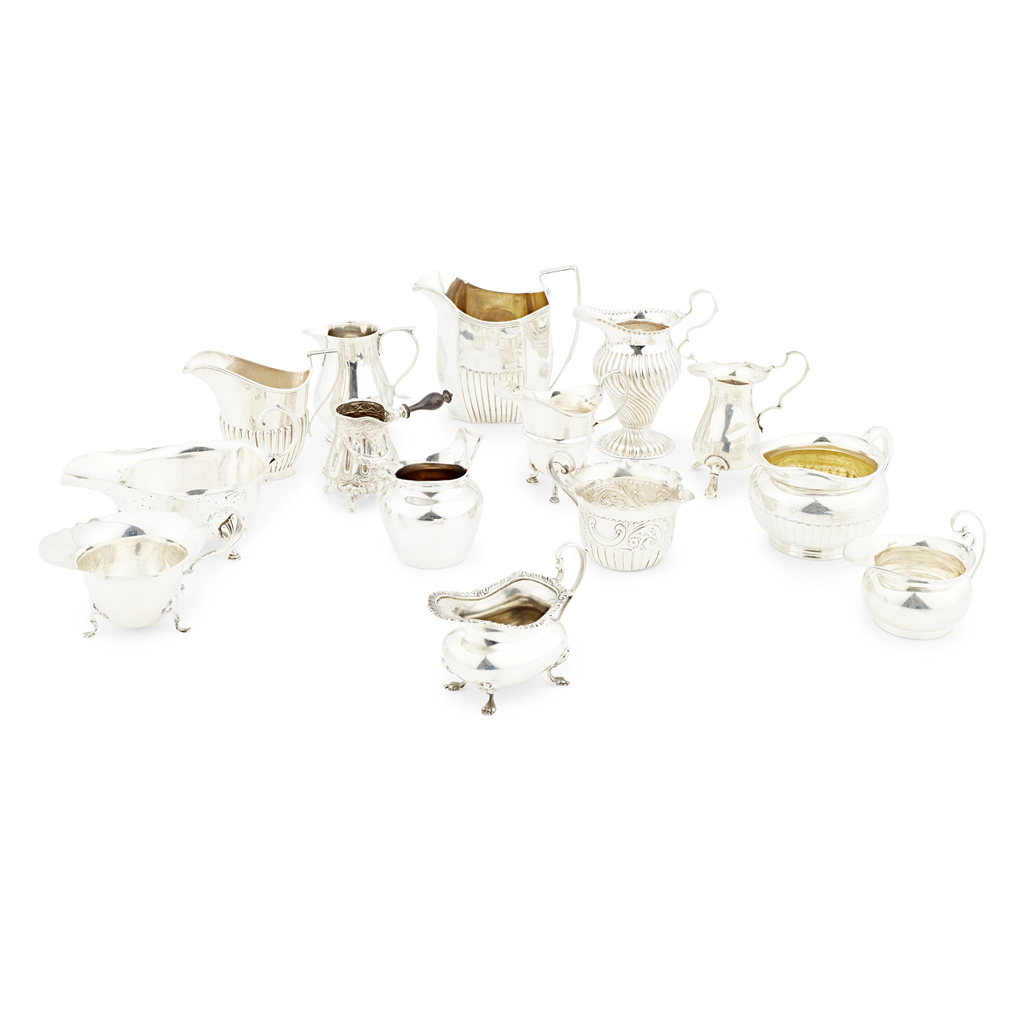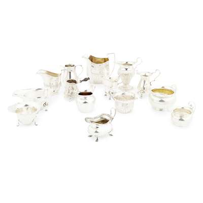various makers marks and dates, of various sizes and shapes; together with a Georgian milk jug, demi-fluted body, erased crest to cartouche and a 19th century small French cream jug with side spout (qty)