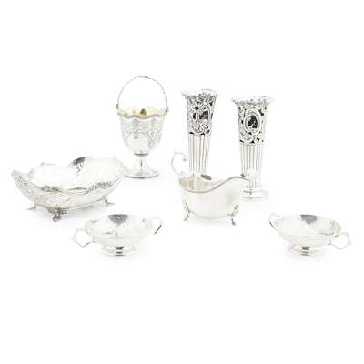 Atkin Brothers, Sheffield 1913, of moulded rectangular form, pierced foliate decoration throughout, vacant heart shaped cartouches to either side, raised on four leaf shaped feet; together with a pair of spill vases, William Hutton & Sons Ltd, London 1899, both of tapered demi fluted form, pierced foliate detail with everted rim; a pair of planished twin handled cups Birmingham 1908; a sauce boat, Birmingham of traditional form, raised on four leaf clasped leg with hoof feet and a swing handled vase, Henry Holland, London 1867, scallop rim, chased scroll detail raised on a spreading foot (7)