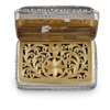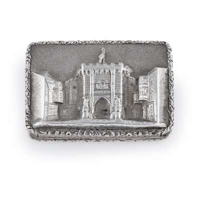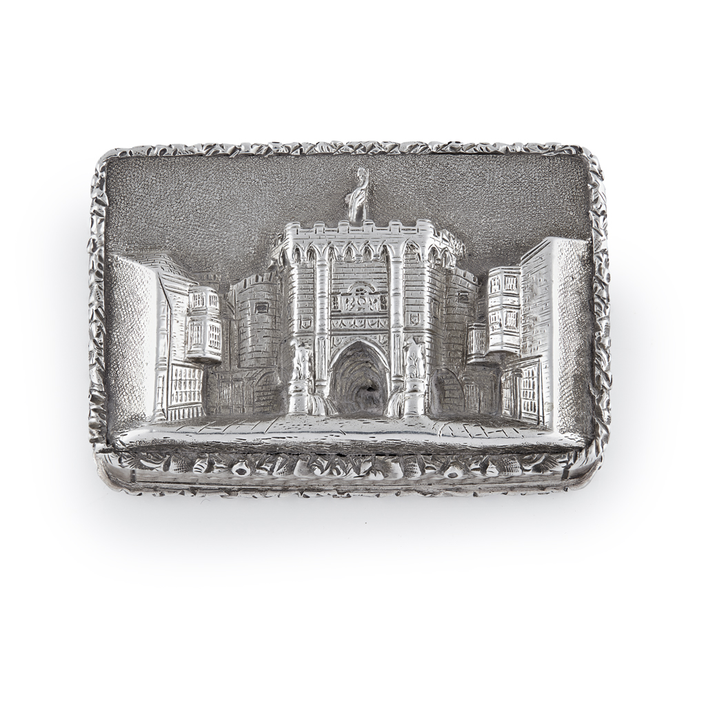 Nathaniel Mills, Birmingham 1843, the hinged cover with a view of The Bargate, Southampton, cast foliate border, engine turned base, the grill pierced with star shape and scrolling feathers