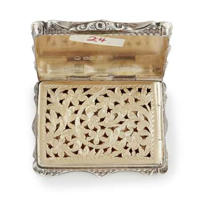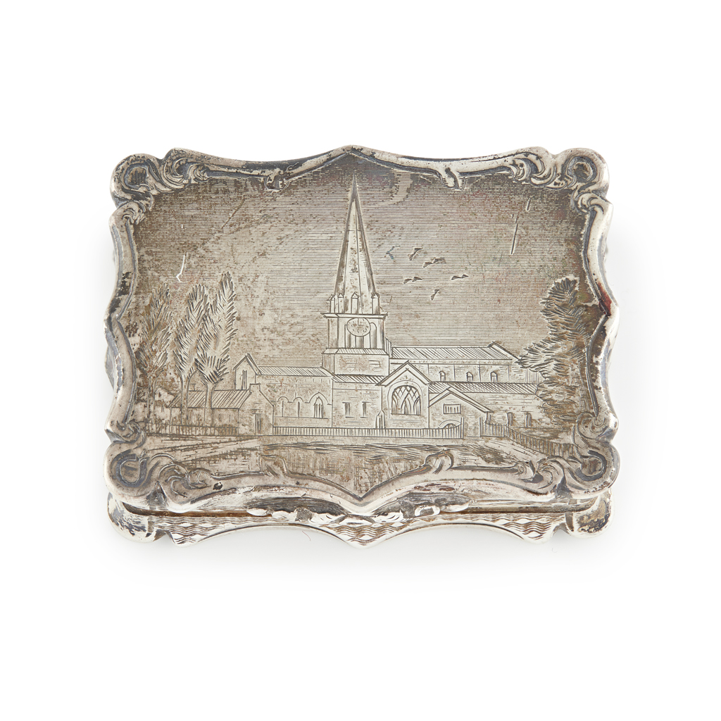Nathaniel Mills, Birmingham 1845, of serpentine rectangular form, the hinged cover engraved with a church, possibly 'St Mary's Church Witney' well engraved and pierced grill