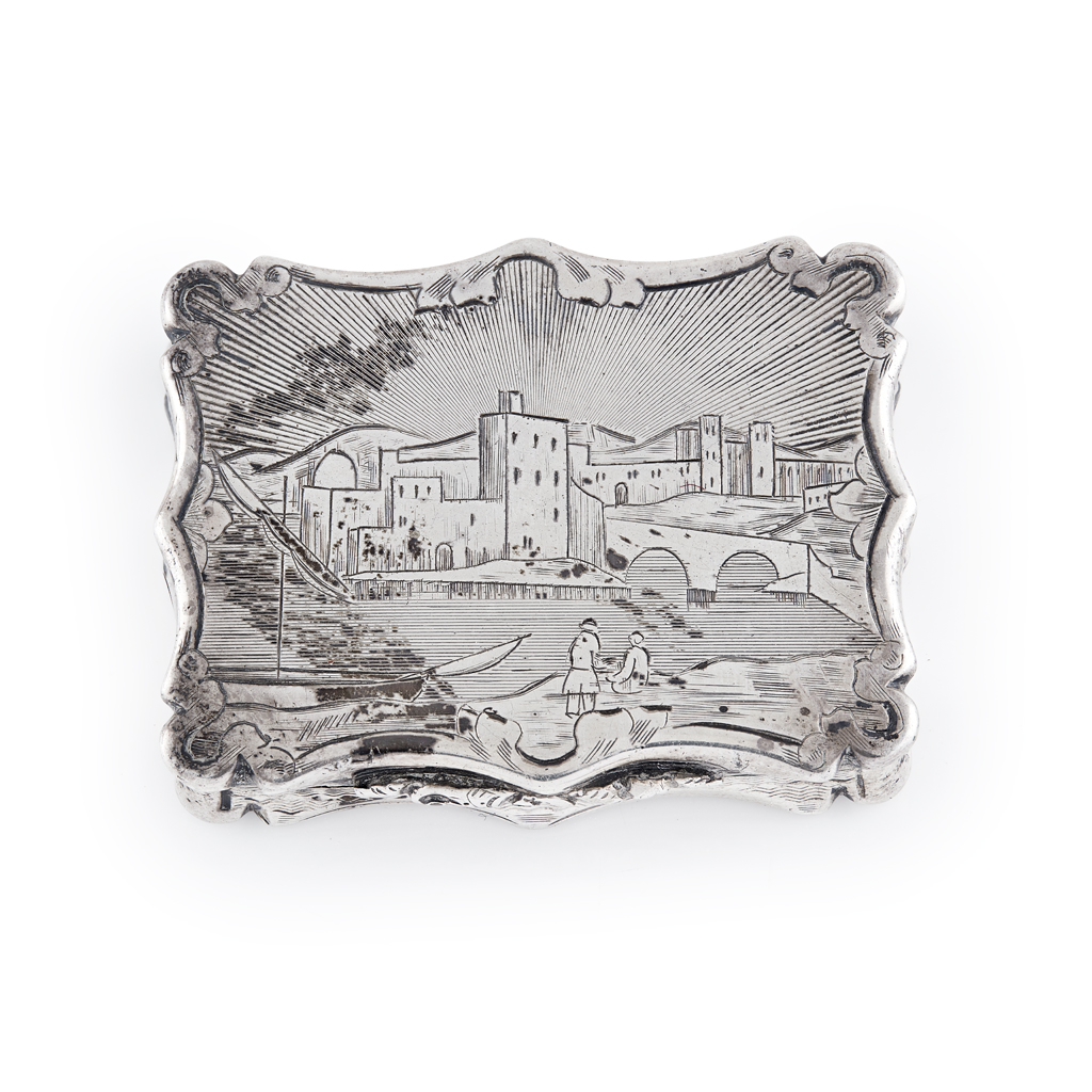 Nathaniel Mills, Birmingham 1846 of serpentine rectangular form, the hinged cover with engraved view of a castle, previously identified as Conway castle