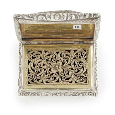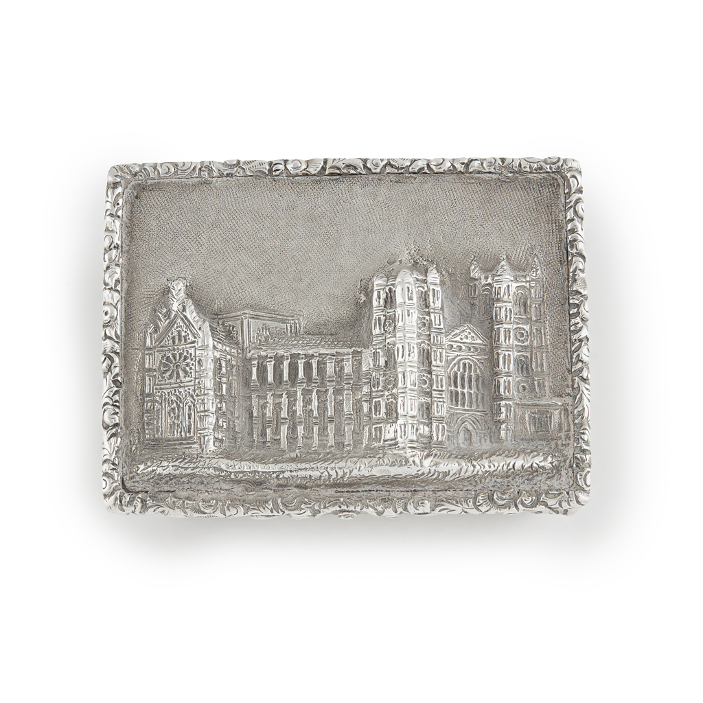 Joseph Willmore, Birmingham 1837, the hinged cover with view of Westminster Abbey, cast borders and thumbpiece, engine turned decorated base