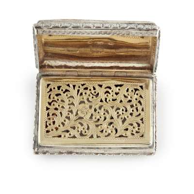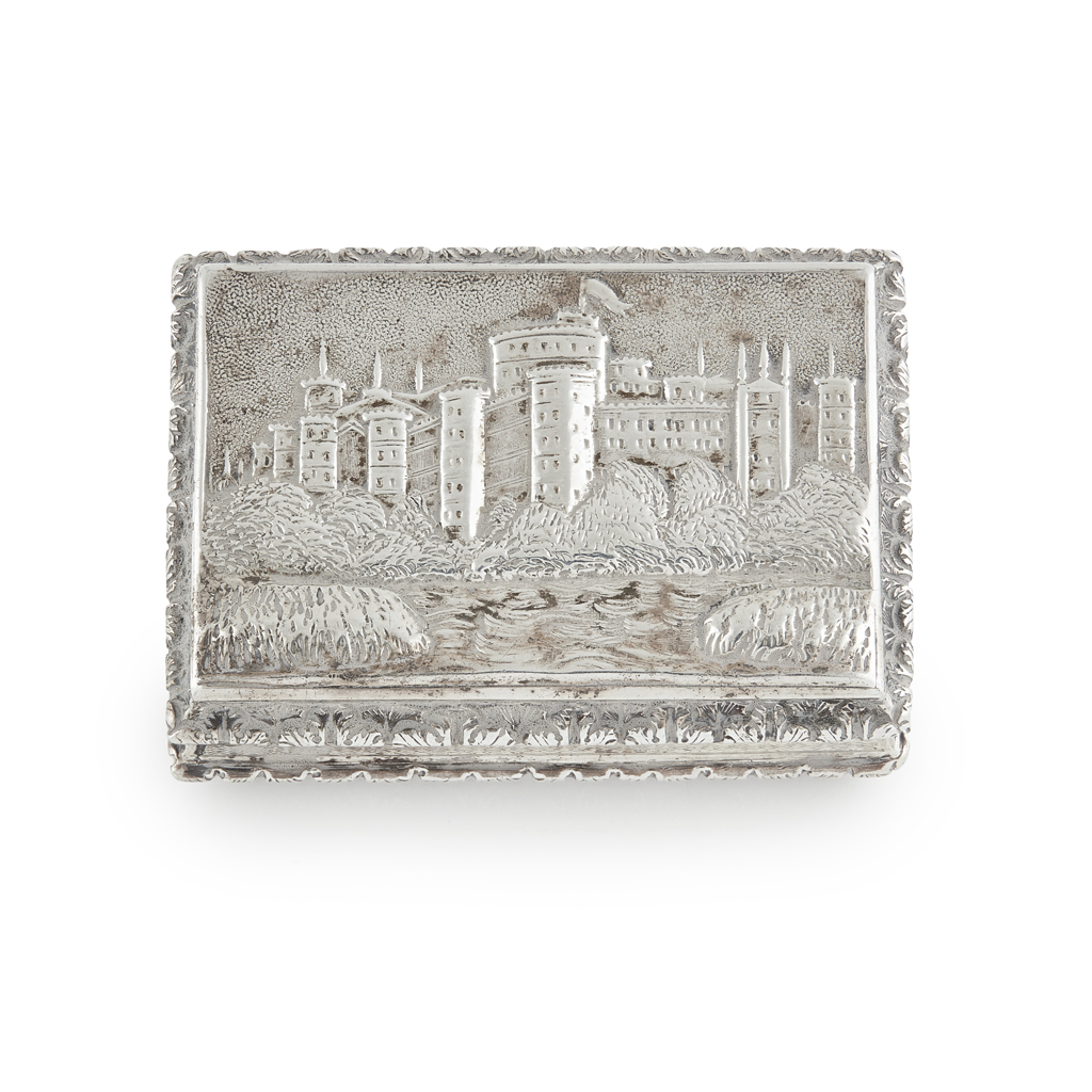 Edwin Jones, Birmingham 1836, the hinged cover with a good corner panorama of Windsor Castle, anthemion cast borders, good engraved gilt grill, base with engine turned decoration