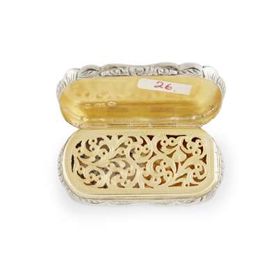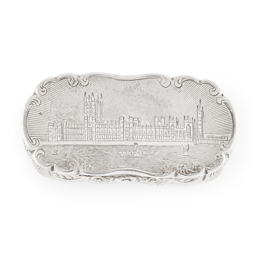 David Phipps, Birmingham 1853, of rounded rectangular form, the cover engraved with Houses of Parliament "Westminster Palace" pierced and engraved scrolling grill, with Tessiers label inside