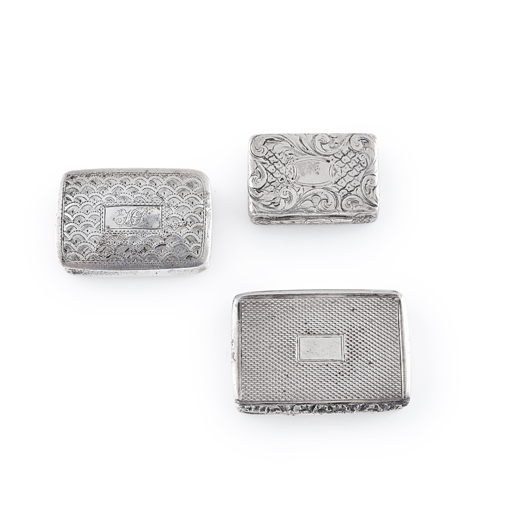 Edward Smith, Birmingham 1848, of rectangular form, simple floral engraving, pierced grill; another, Joseph Willmore, Birmingham 1832 of rectangular form, cast thumbpiece, engine turned ground pierced grill with floral design; together with another, Nathaniel Mills, Birmingham 1839, of rectangular form, engraved lunette motif to cover and floral spray to the base, floral decorated grill (3)