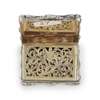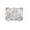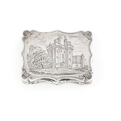 Nathaniel Mills, Birmingham 1843, of serpentine rectangular form, the hinged cover engraved with Lancaster Castle, attractive floral pierced and gilt grill