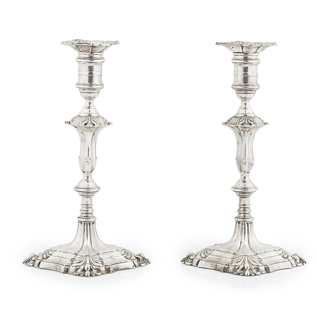 Hamilton & Inches, Edinburgh 1920, knopped baluster stem, stepped square base with leaf clasped corners, the removable sconce similarly decorated (loaded) (2)