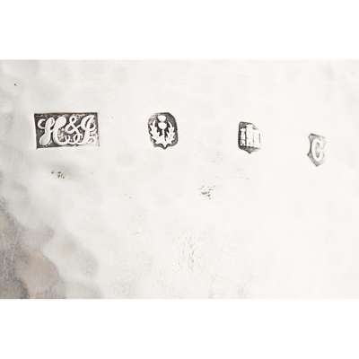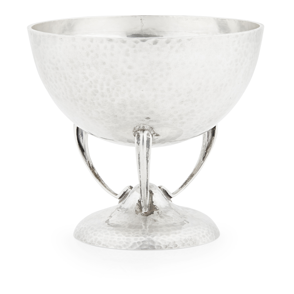 Hamilton & Inches, Edinburgh 1908, the deep planished bowl with three curved supports, to a planished domed foot