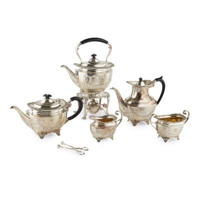 Hamilton & Inches, Edinburgh comprising spirit kettle, water pot, teapot, twin handled sugar basin and milk jug, all of oval demi-fluted form, cast gadroon and shell border, leaf clasped C scroll handles, raised on four bracket feet with shell decoration, initials AE engraved to body; together with a pair of sugar nips marked WB, only probably 18th century (6)