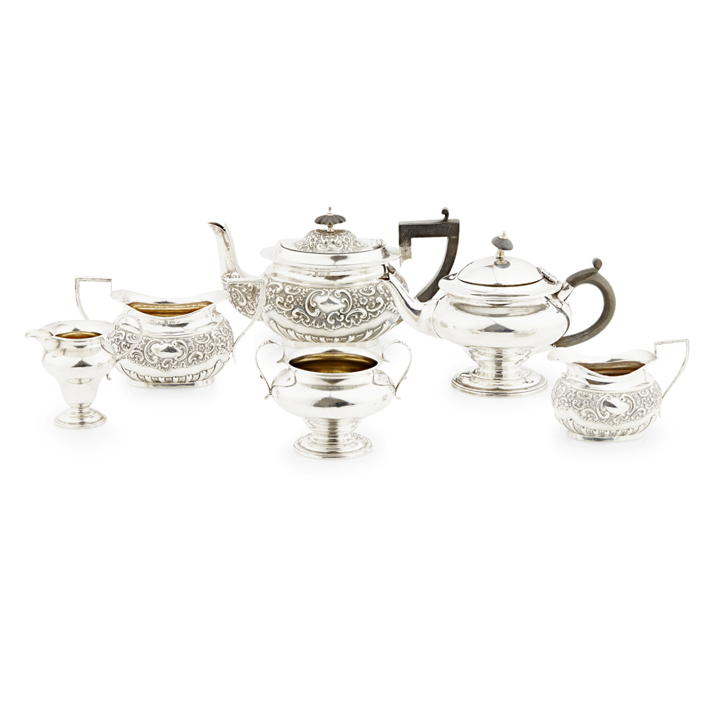 William Adams Ltd, Birmingham 1903, comprising teapot, twin handled sugar basin and milk jug, all of oval form, demi-fluted bodies, heavily embossed floral and scroll decoration, vacant cartouche to either side of body, angular handles; together with another bachelor three piece service, London 1907, comprising teapot, twin handled sugar basin and milk jug, all of circular tapered form, S scroll handles (6)
