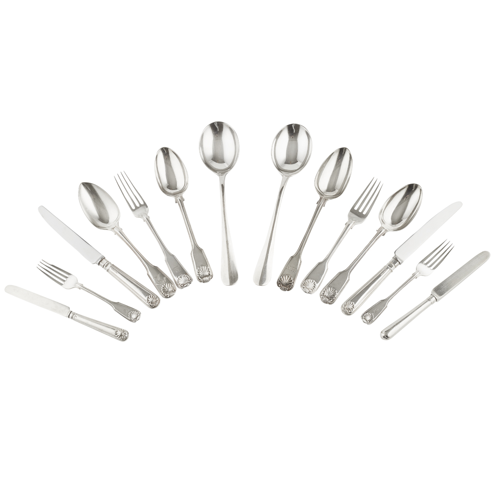 various makers and dates, predominantly 19th century, comprising seventeen table spoons, twenty table forks, twelve dessert forks, twenty silver handle knives, twenty six filled handle silver knives and forks, crest to terminal; together with a collection of miscellaneous caddy and salt spoons; a plated soup ladle, a pair of plated serving spoons and a collection of plated and foreign flatware (qty)