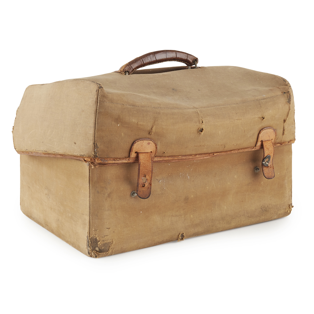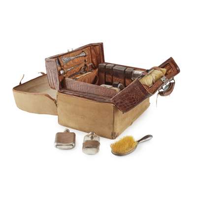 Charles Fox & Co Ltd, London 1901, the crocodile Gladstone type bag containing various dressing table bottles, brushes, shoe horns, hip flask, with silver mounts hammered finish, presented in an outer removable travelling cover
