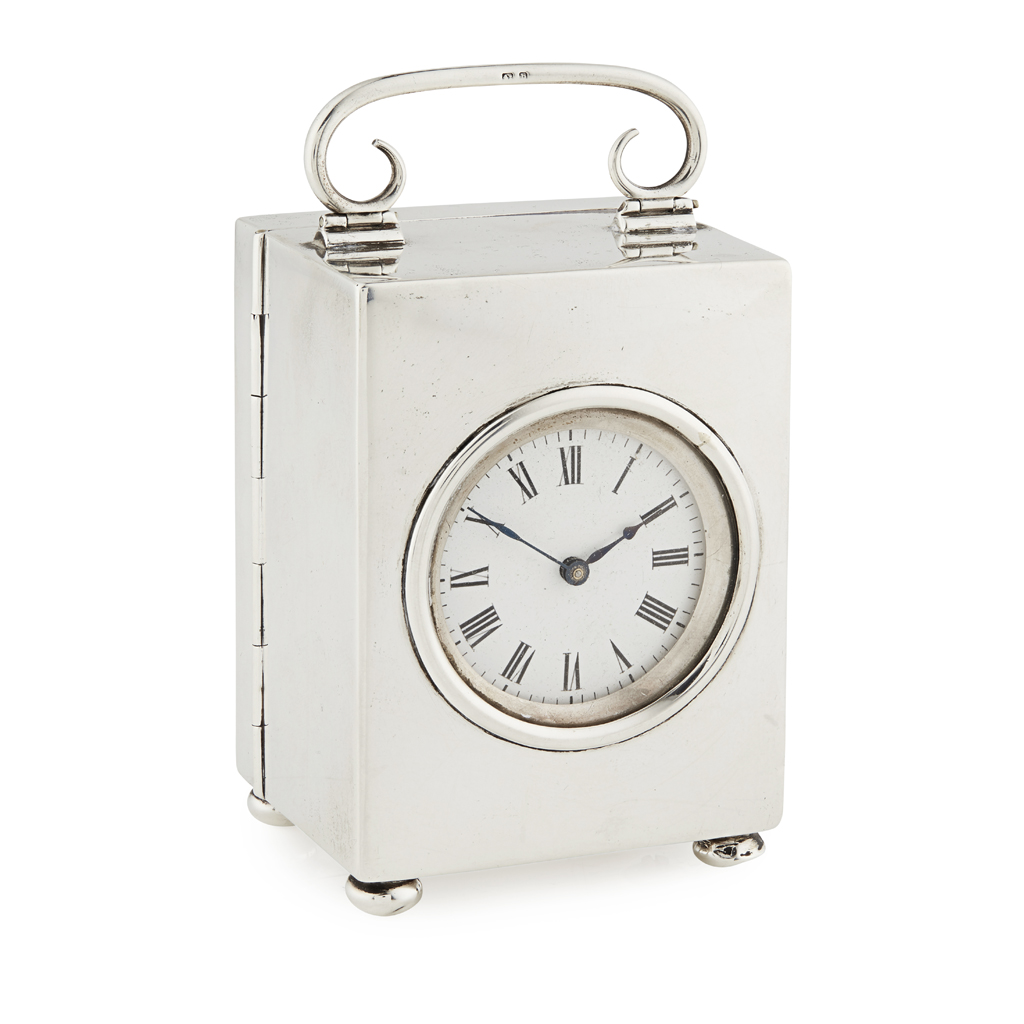 A silver cased dressing table carriage type clock
