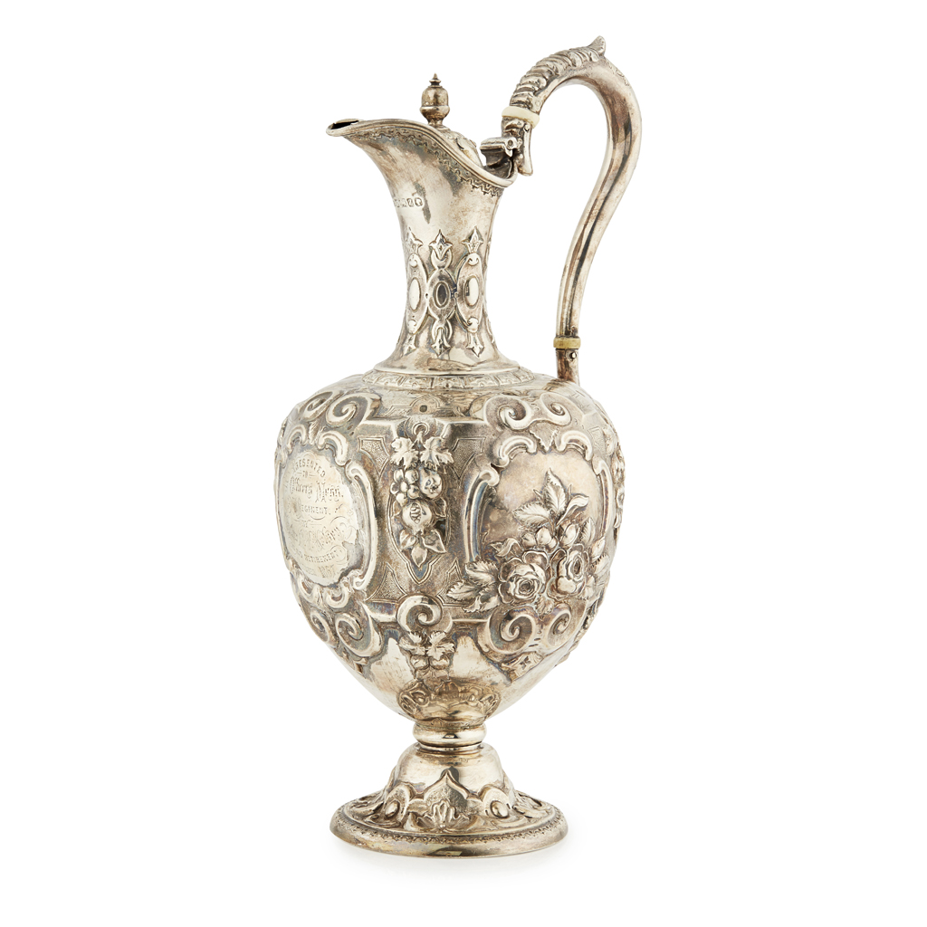 Martin, Hall & Co, Sheffield 1867, of baluster form, heavily embossed rose and floral detail throughout, cartouche to body with presentation engraving '...to The Officer Mess, 36th Regiment by Captain ***, on his retirement...1867' hinged lid with acorn finial, leaf clasped S scroll handle