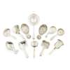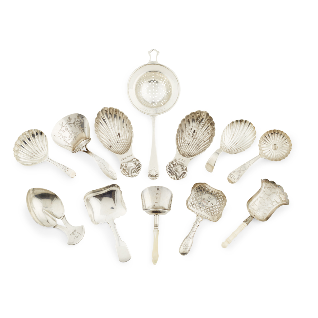 five various Georgian shovel shaped spoons, one Samuel Pemberton, two with turned mother of pearl handles; a small George III caddy spoon with heart shaped bowl; three various Georgian scallop bowl shaped caddy spoons; two modern caddy spoons, shell shaped bowl and handle; together with a tea strainer, Hamilton & Inches, Edinburgh 1921, of Shell pattern (12)