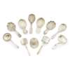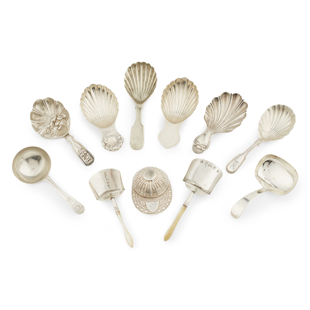 two similar shovels, Samuel Pemberton, turned mother of pearl handles; a fiddle pattern EP caddy spoon; a Continental style spoon with stamped shell decoration; scallop bowl with applied shell to the short handle; a George III example with bright cut engraving decoration; a modern copy of a Jockey hat caddy spoon; three various scallop bowl examples and a modern caddy spoon with rectangular bowl (11)
