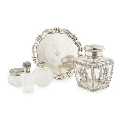with 800 standard pull of cover, glass stopper, the sleeve to the glass body cover emblematic of the seasons; a small waiter, modern, engraved initial and three silver mounted crystal dressing table jars (5)