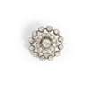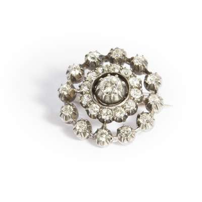 claw set with an old round cut diamond, in two borders of smaller round cut diamonds, unmarked