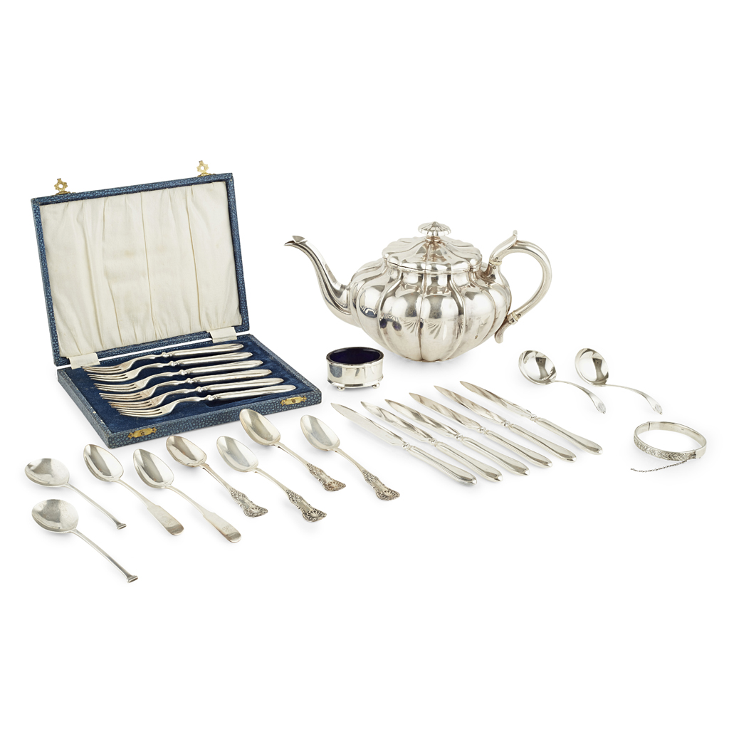 John Bridge of Rundell Bridge and Rundell, London 1830, of fluted melon form with fluted curved spout and hinged cover with similar finial together with a set of ten single struck teaspoons, JM, Glasgow 1821, of modified King's pattern; a set of six Fiddle pattern teaspoons, Edinburgh; three fig bowl teaspoons, William Hair Hassler, Birmingham 1926; one arts and craft style ladle; a silver bangle, one modern salt with glass liner; together with a plated cased set of forks and a cased set of knives and two plated sauce ladles (qty)