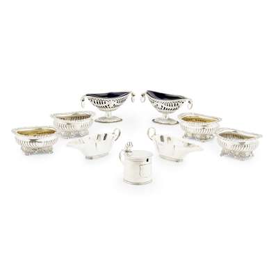 Joseph Angell I, London 1821, of low rounded rectangular baluster form with fluted decoration, cast foliate and gadrooned rim, raised on four bracket and paw feet; together with a pair of later cast oval Adam style open salts with liners by I S Greenberg & Co, Birmingham 1898; a Georgian drum mustard and a pair of modern sauce boats, single serving size, Birmingham 1905 (9)