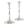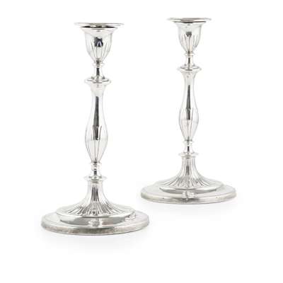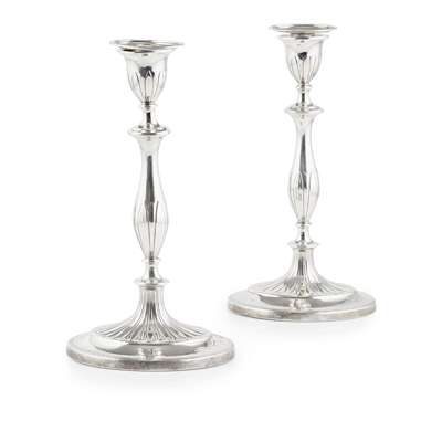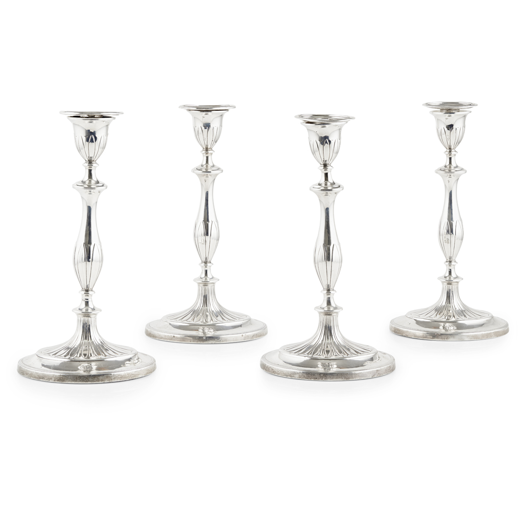 John Green, Roberts, Mosley & Co, Sheffield 1793/4, of oval form, baluster column with embossed foliate detail the spreading foot with similar detail, italic RF engraved to base, removable sconces, (loaded) (4)
