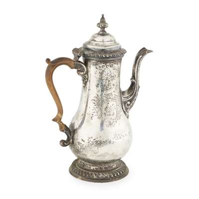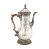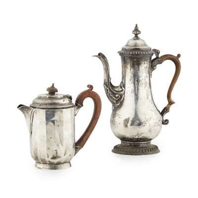 AP, London 1765, of traditional baluster form, long fluted spot and S scroll wooden handle, with domed cover with bud finials and gadrooned rim, raised on a short stem and gadrooned foot; together with a coffee pot, Mappin & Webb, Birmingham 1926, of panelled form (2)