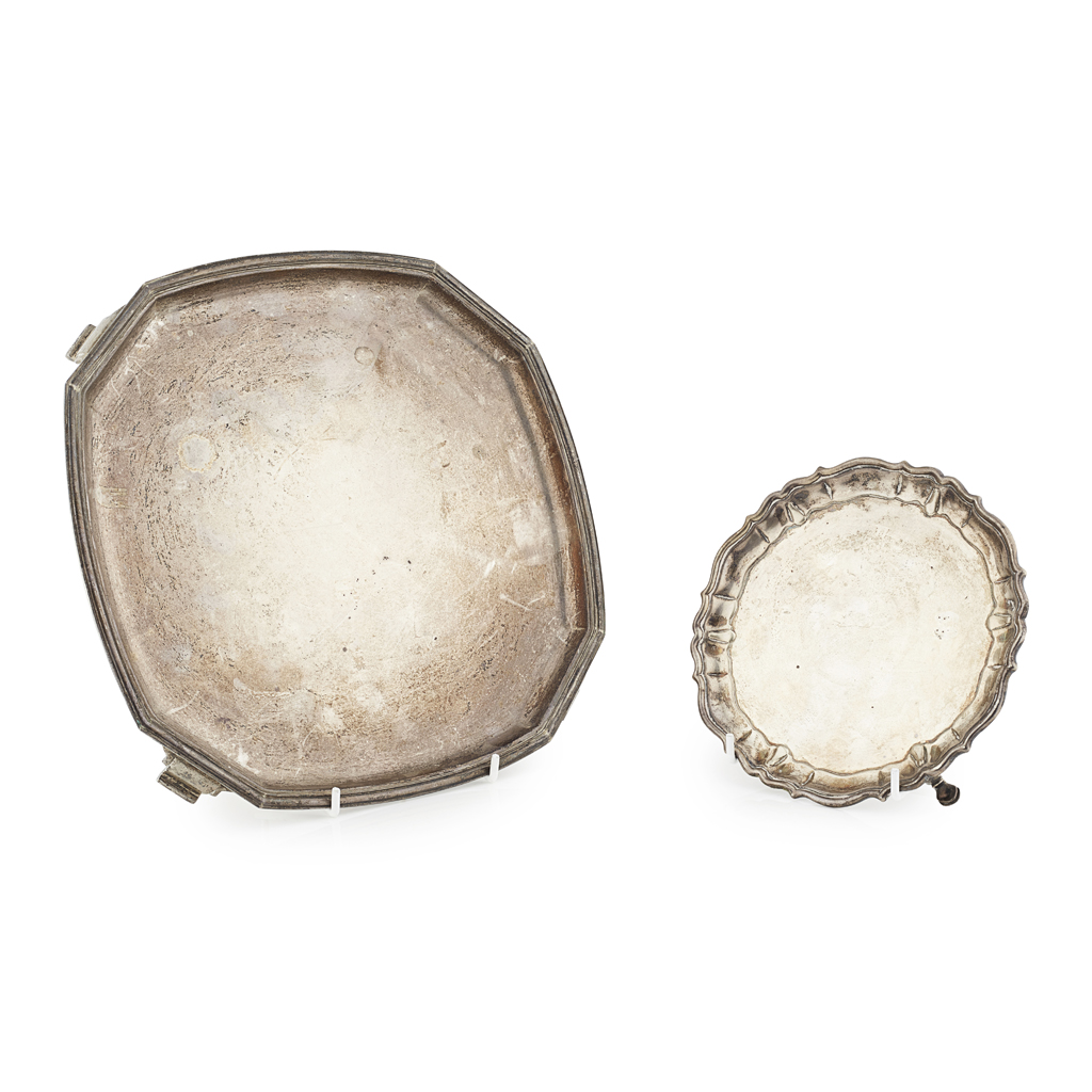 James Shruder, London 1744, of round form, serpentine border, plain flat and raised on hoof feet; together with a Britannia standard small salver, Goldsmiths and Silversmiths, London, 1937, of slight canted square form, bracket feet (2)