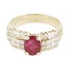 claw set with an oval cut ruby, each shoulder set with small round and square cut diamonds, to a plain shank, stamped 750