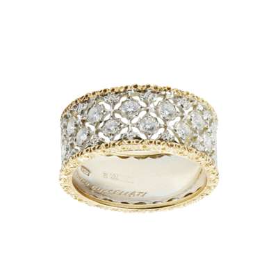 the front with pierced trellis detail set throughout with small round brilliant cut diamonds, textured bright cut detail to reverse, signed Frederico Buccellati