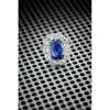 claw set with an oval cushion cut Madagascan unheated sapphire, in a border of round brilliant cut diamonds, to a plain white metal shank, stamped 18ct