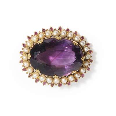 claw set with a large oval mixed cut amethyst, in a border of half-pearls and small round cut rubies, unmarked