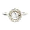 millegrain set with an old round cut diamond, in a border of old round cut diamonds, to a plain unmarked white metal shank