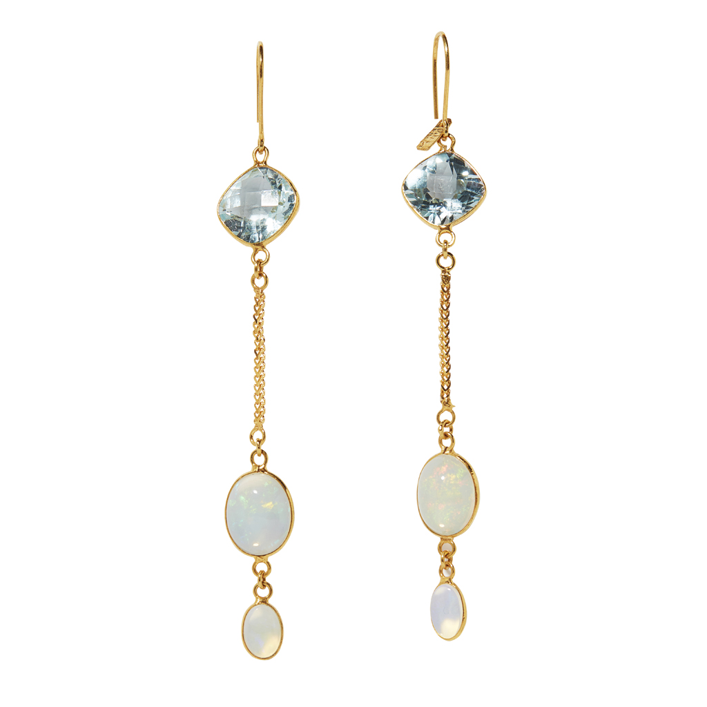 each collet set with a mixed-cushion cut aquamarine, suspending a flattened curb link chain collet set with two opal cabochons, to hook fittings