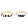 claw set with three graduated round cut sapphires, to an 18ct yellow gold shank; together with a diamond and sapphire set half eternity ring, to an 18ct yellow gold shank (2)