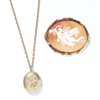 of oval outline, depicting two classical figures, in an unmarked yellow metal mount; together with a yellow metal pendant locket, with engraved detail, to a long fancy link chain, stamped 12kt (2)