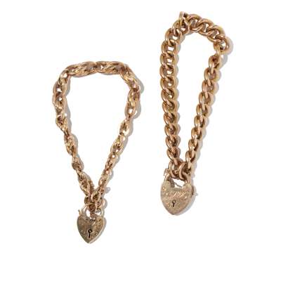 the first composed of plain hollow-curb links, to a heart-shaped padlock clasp with engraved initials; the second composed of fancy oval links, to a heart-shaped padlock clasp (2)