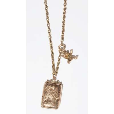 the chain composed of plain belcher links, stamped 9ct, suspending a rectangular locket with engraved detail, and small 'teddy-bear' pendant, stamped 9c