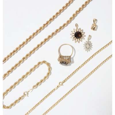 to include a 9ct gold rope-twist necklace and matching bracelet; a 9ct gold flattened curb link necklace; a 9ct gold smokey quartz cocktail ring and associated pendant; a diamond cluster pendant, bale stamped 10k; a citrine set pendant, stamped 10k; together with a collection of three gemstone specimen sets, to include various examples of cut and polished gemstones, including aquaprase, spinel, emerald, alexandrite, apatite, tanzanite, sapphire etc. (qty)