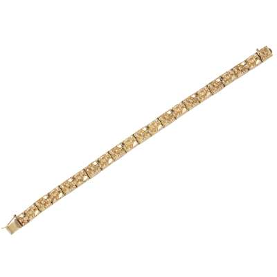 composed of rectangular links, modelled as stylised gold nuggets with a textured finish, to a concealed clasp and safety clips, stamped 14k