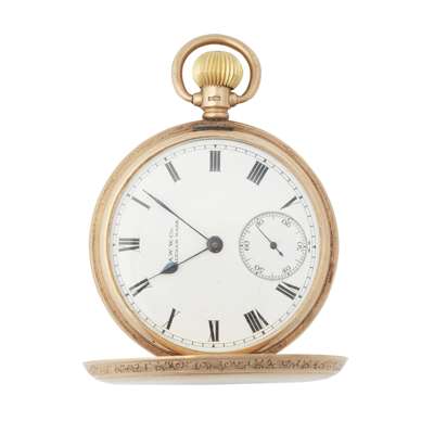 the dial signed A.W.W.Co. Waltham, Roman numerals, subsidiary seconds dial, plain hunting case, chased border, plain English lever movement No.22043368, keyless wind
