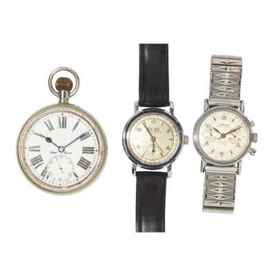 silvered type dial, outer date dial in red, gilt Arabic and dot indicators, subsidiary seconds dial, with day and month aperture, leather strap; together with a gentleman's stainless steel chronograph, Lanco, off white dial, gilt Arabic and dot indicators, later flexible bracelet; a military issue pocket watch, keyless wind, dial inscribed 5241 RC45, Roman numerals, subsidiary seconds dial, screw off rear cover with ordinance arrow, PATT 300 and 1884 (3)